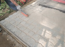 Засыпаем брусчатку пескобетоном, снимаем лишний слой, замываем.