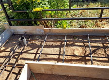 Далее выставляем опалубку, определяем место под цветник. Внутрь участка закладываем частую арматурную сетку. Там, где это возможно, привариваем её к сваям.